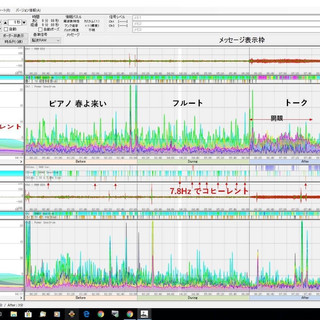 上段が庄司みどりさん下段が土御門乾越さんの脳波の一部です.何とお2人は7.8Hzで頻繁にコヒーレント(周波数と位相が完全に一致)になったんです.(赤矢印の部分)